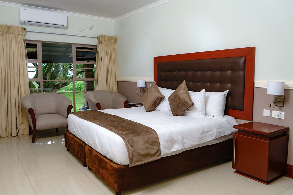 The rooms overlook a lush garden courtyard with bright country flowerbeds, shrubs, and creepers. These rooms are conveniently laid out in a half-moon shape encasing the courtyard, giving the hotel the feel of an intimate family unit similar to the layout of the nearby Great Zimbabwe Monuments.